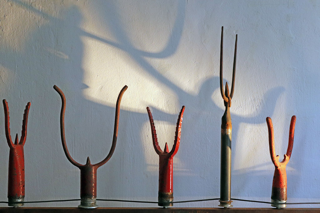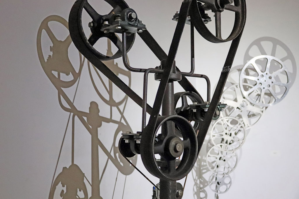Neben dieser erwünschten Reflexion spielt für Reiche die Ästhetik des Seriellen eine wesentliche Rolle. Ob in linearer Reihung auf einer Höhe (wie etwa bei den Kunstmaschinen „Gebetsmühle II“ und „Dancing Devils“) oder versetzt gegenüberliegend auf verschiedenen Ebenen (wie beispielsweise bei „Luminaire“, „Kat Kat“ und „Vierklang“) – die Wiederholungen gleichartiger Elemente verleihen den Kunstmaschinen eine ungewohnte, charakteristische Ästhetik, die das kinetische Gefüge zu neuartigen Objekten ganz eigener Prägung werden lassen. So entsteht etwa aus insgesamt sieben senkrechten, symmetrisch angeordneten Bügelmulden, die aus einer größeren Heißmangel und sechs kleineren Walzenbügelmaschinen stammen, eine kinetische Skulptur, deren Formensprache an Stilmerkmale des Art déco erinnert und Assoziationen zu den „Goldenen 1920er Jahren“ hervorruft. Diese Komposition betitelt Reiche angesichts ihrer Bestandteile und der grafischen Wirkung augenzwinkernd als „Bügelpalast“.